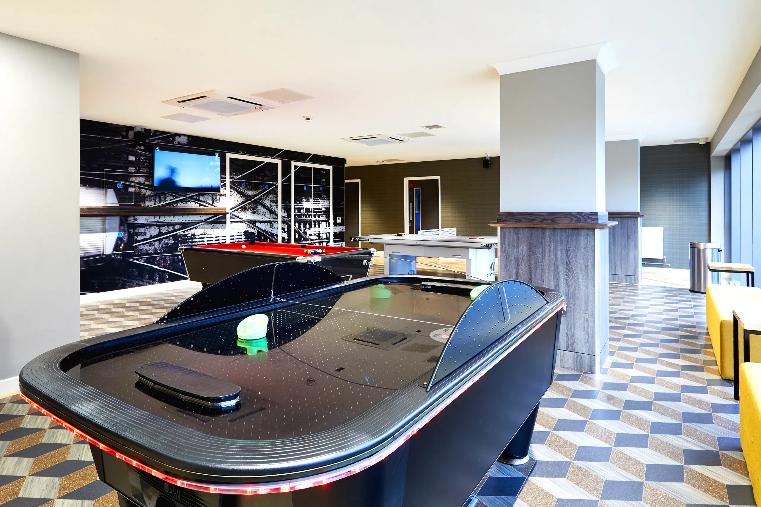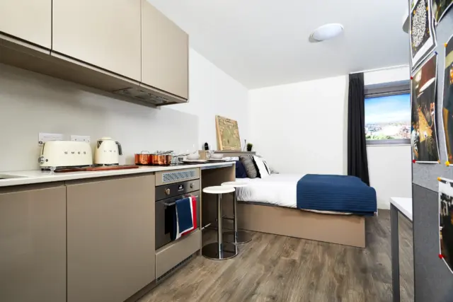 - Bed, under-bed storage, desk, chair, Smart TV, wardrobe and chest of drawers