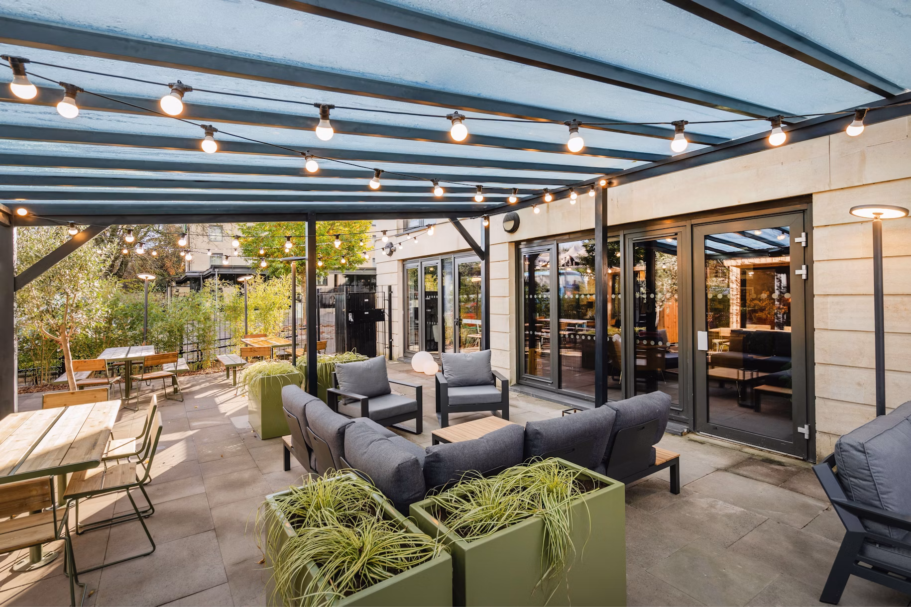 Double bed, desk, chair and wardrobe included in the room - Outdoor social space