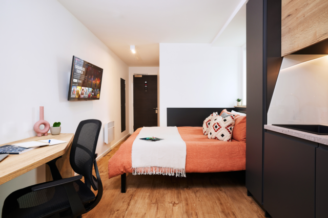 - Bed, under-bed storage, desk, chair, Smart TV, wardrobe and chest of drawers