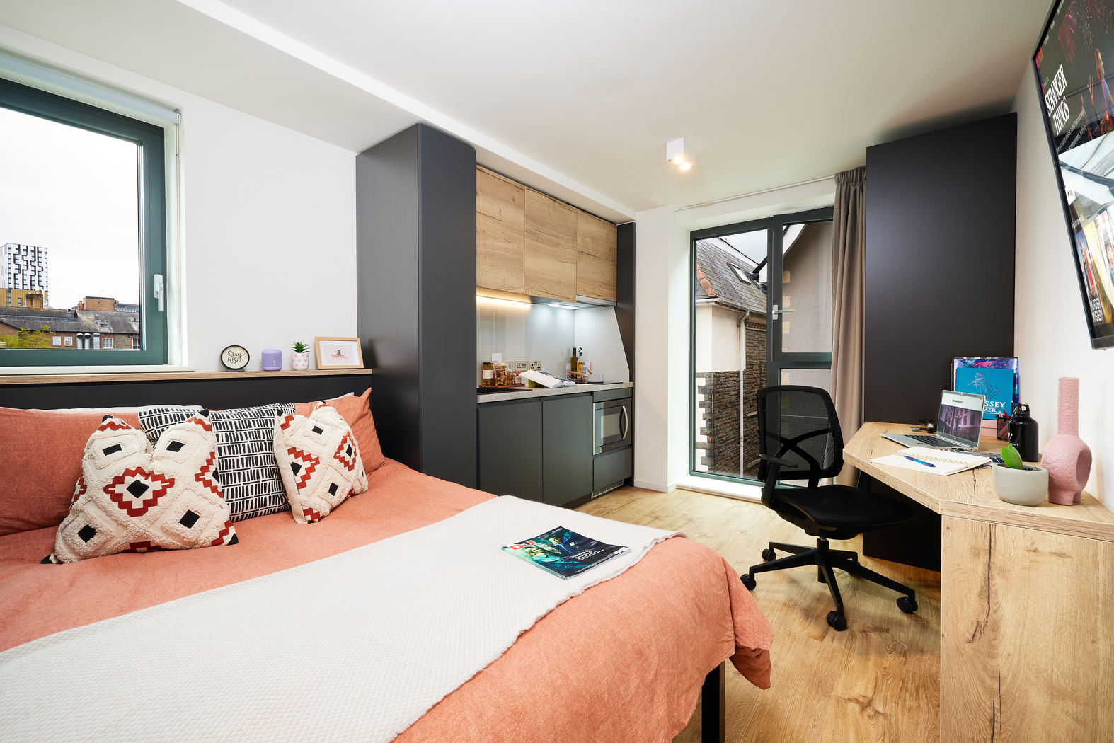 - Bed, under-bed storage, desk, chair, Smart TV, wardrobe and chest of drawers