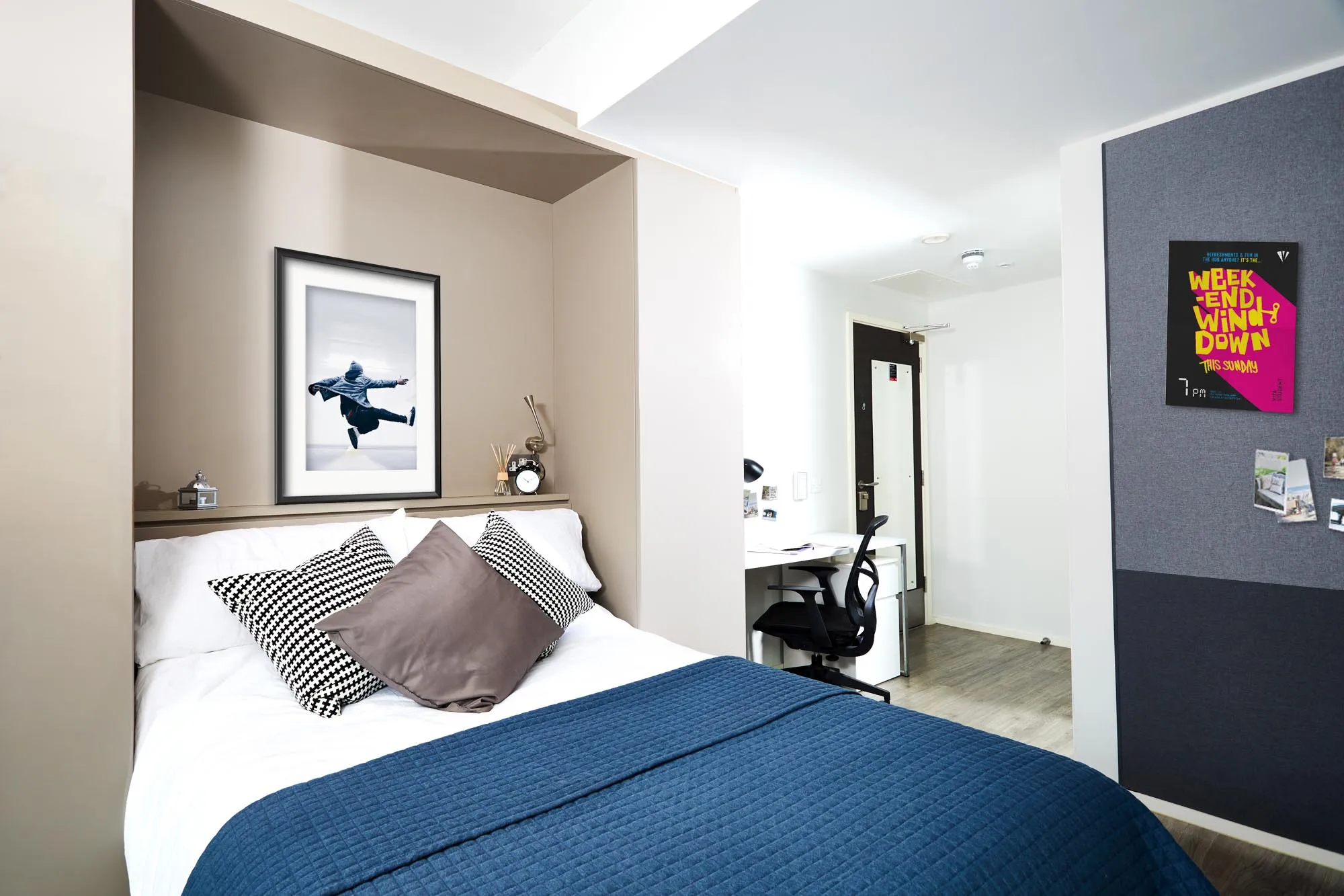 • Bed, under-bed storage, desk, chair, Smart TV, wardrobe and chest of drawers