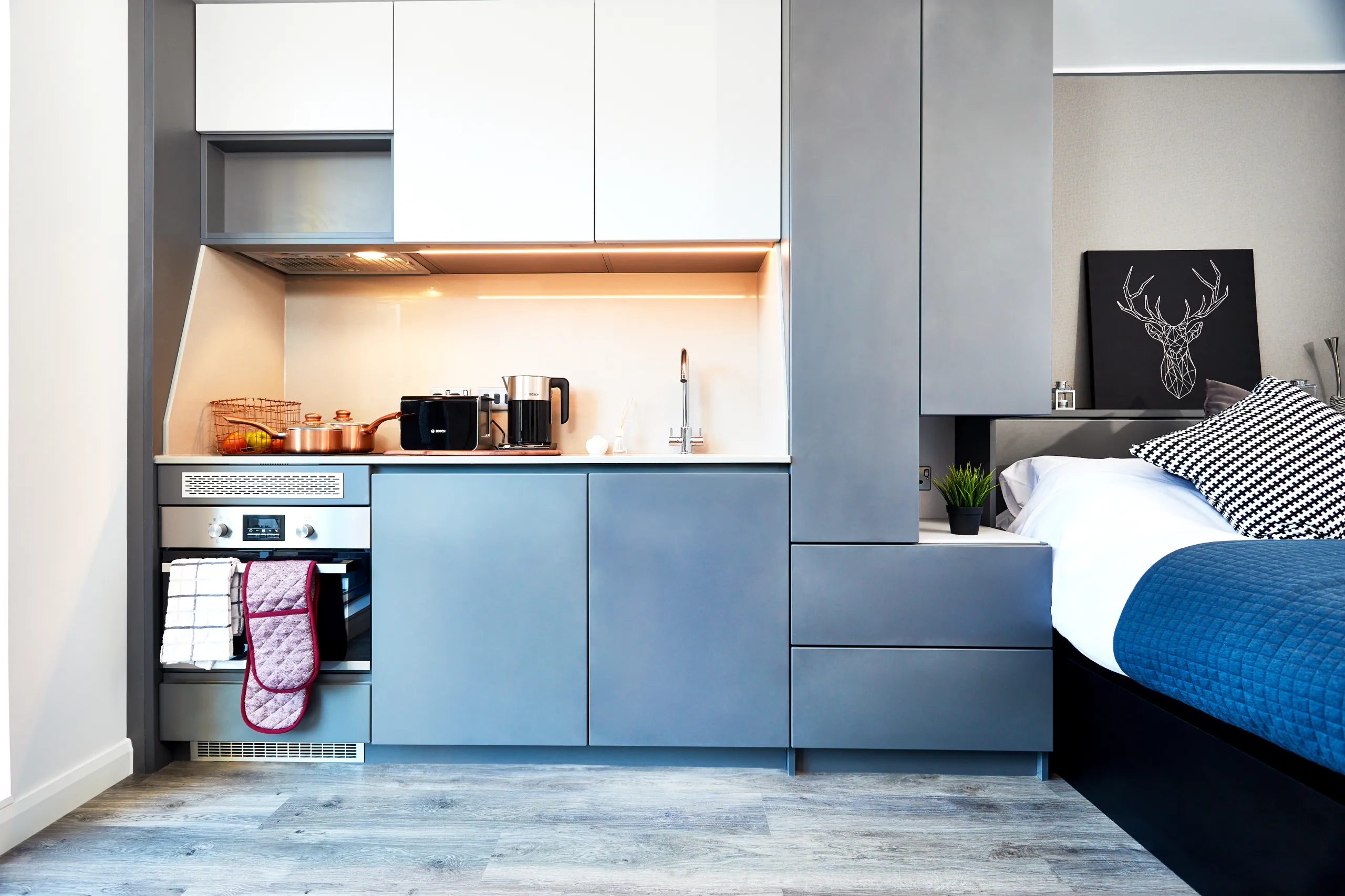 - Studio with in-room kitchen bathroom with shower, toilet and basin
