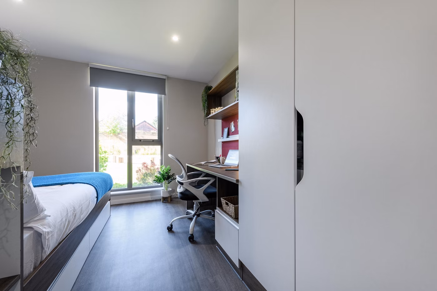 - Wardrobe, underbed storage, full-length mirror, personal study space with desk and chair