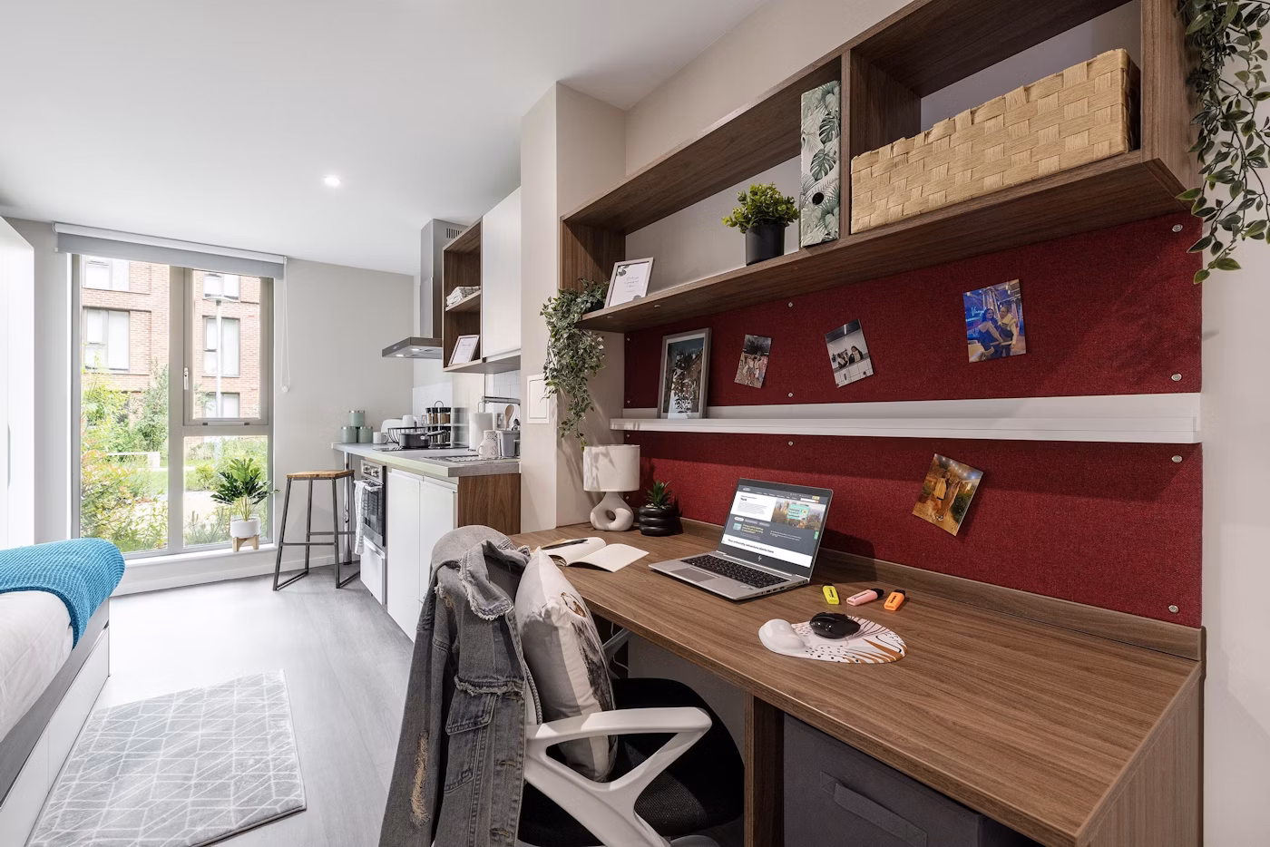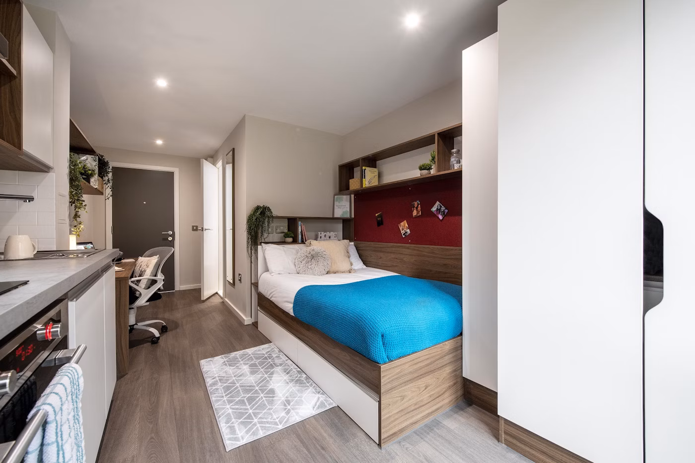 - Bed, underbed storage, wardrobe, personal study space with desk and chair