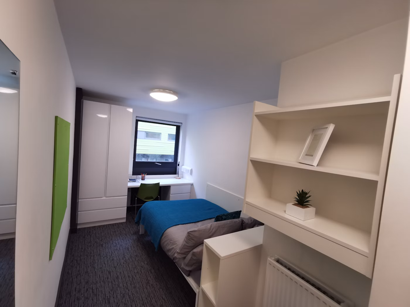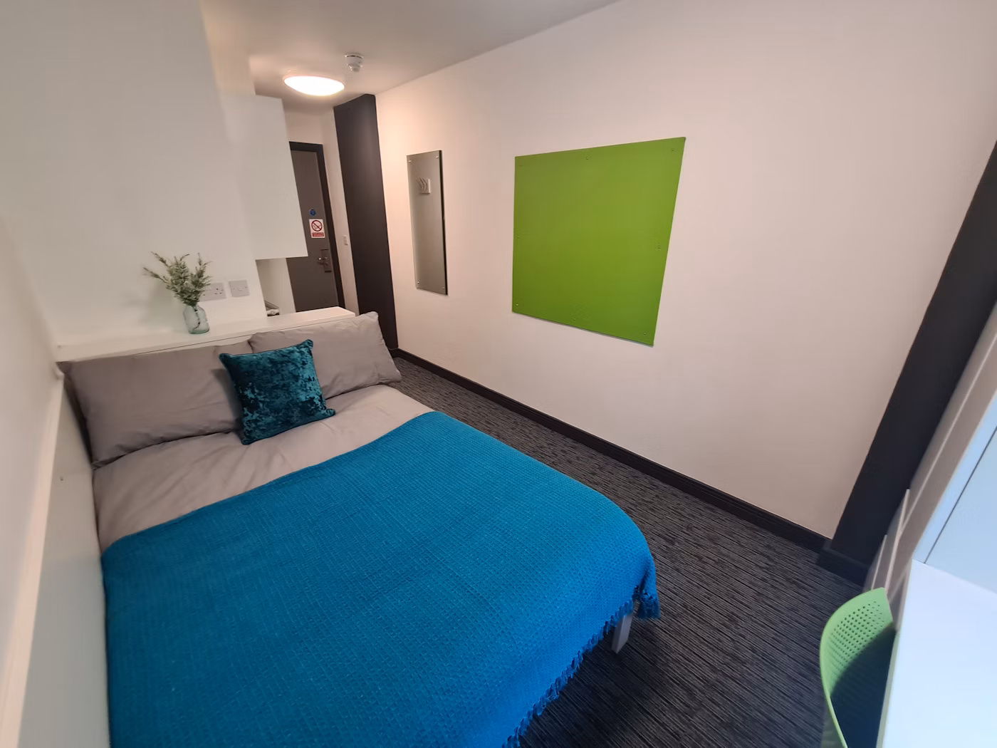 - Small double bed, under-bed storage, desk, chair, wardrobe and chest of drawers