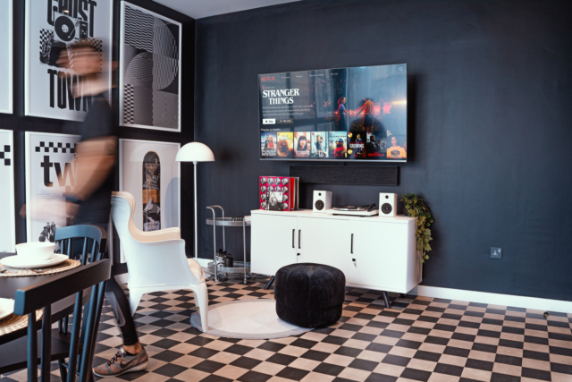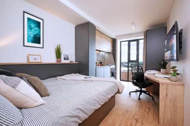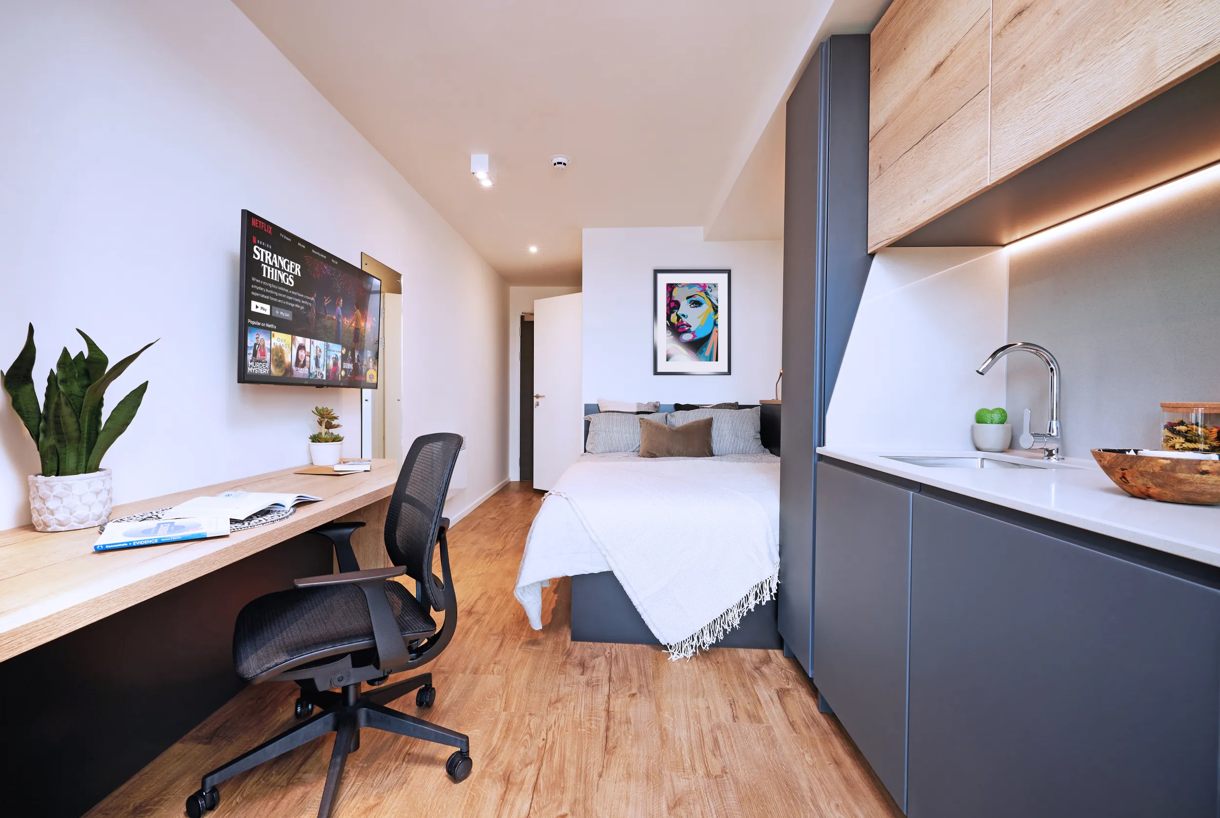 - Bed, under-bed storage, desk, chair, Smart TV, wardrobe and chest of drawers