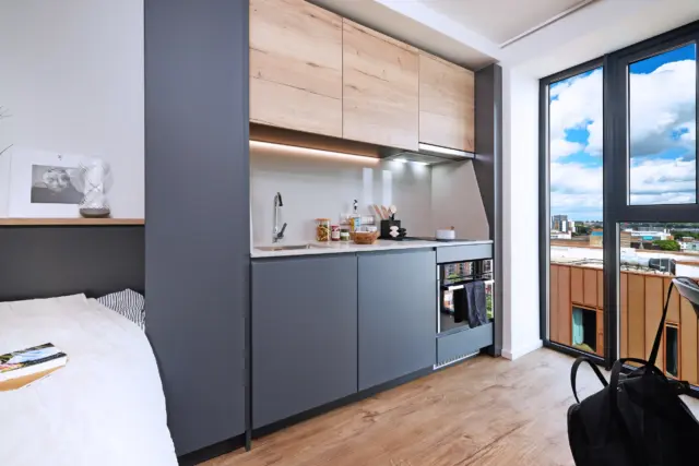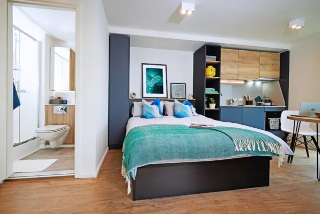 - Studio with in-room kitchen bathroom with shower, toilet and basin
