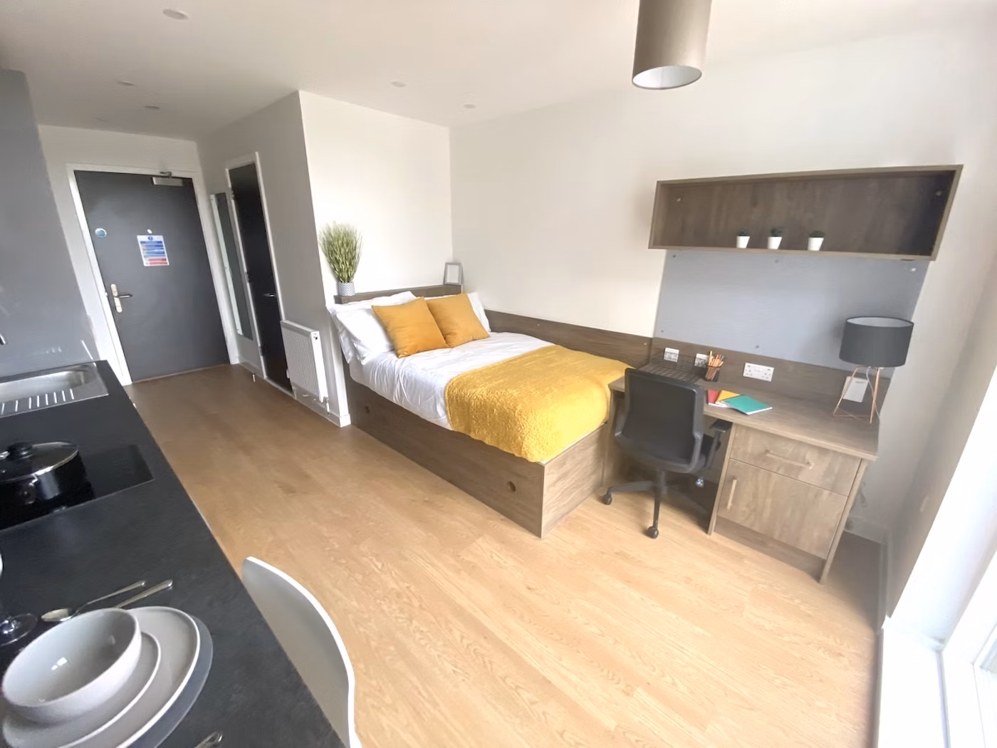 - Small double bed, underbed storage, wardrobe, personal study space with desk and chair